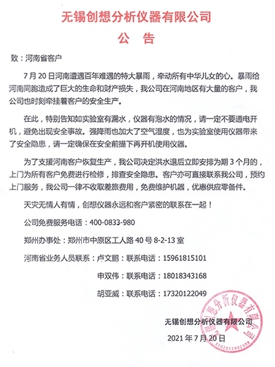心系洪災,創(chuàng)想儀器告河南省客戶通知書
