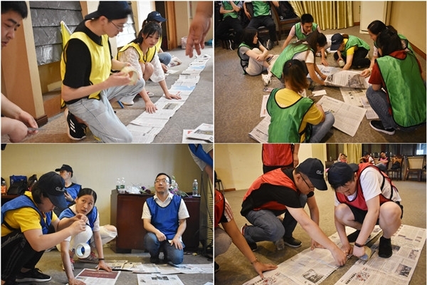 報紙成為了“履帶”,成員們利用膠帶,將“履帶成形”,在接下來的行進(jìn)中可不能斷了,“盡可能牢固!!”