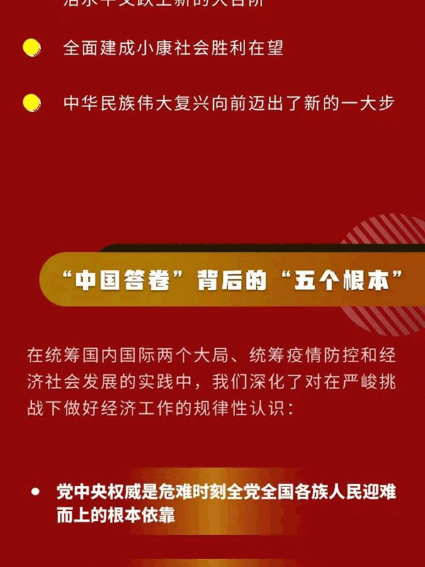 會議強調(diào),在統(tǒng)籌國內(nèi)國際兩個大局、統(tǒng)籌疫情防控和經(jīng)濟社會發(fā)展的實踐中,我們深化了對在嚴峻挑戰(zhàn)下做好經(jīng)濟工作的規(guī)律性認識:黨中央權威是危難時刻全黨全國各族人民迎難而上的根本依靠,在重大歷史關頭,重大考驗面前,黨中央的判斷力、決策力、行動力具有決定性作用;人民至上是作出正確抉擇的根本前提,只要心里始終裝著人民,始終把人民利益放在最高位置,就一定能夠作出正確決策,確定最優(yōu)路徑,并依靠人民戰(zhàn)勝一切艱難險阻;制度優(yōu)勢是形成共克時艱磅礴力量的根本保障,只要堅定“四個自信”,堅持集中力量辦大事的制度優(yōu)勢,就一定能夠使全黨全國各族人民緊密團結起來,發(fā)揮出攻堅克難、推動事業(yè)發(fā)展的強大能量;科學決策和創(chuàng)造性應對是化危為機的根本方法,只要準確識變、科學應變、主動求變,就一定能夠在抗擊大風險中創(chuàng)造出大機遇;科技自立自強是促進發(fā)展大局的根本支撐,只要秉持科學精神、把握科學規(guī)律、大力推動自主創(chuàng)新,就一定能夠把國家發(fā)展建立在更加安全、更為可靠的基礎之上。