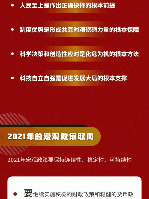 會議指出,明年宏觀政策要保持連續(xù)性、穩(wěn)定性、可持續(xù)性。要繼續(xù)實施積極的財政政策和穩(wěn)健的貨幣政策,保持對經(jīng)濟恢復的必要支持力度,政策操作上要更加精準有效,不急轉(zhuǎn)彎,把握好政策時度效。要用好寶貴時間窗口,集中精力推進改革創(chuàng)新,以高質(zhì)量發(fā)展為“十四五”開好局。積極的財政政策要提質(zhì)增效、更可持續(xù),保持適度支出強度,增強國家重大戰(zhàn)略任務財力保障,在促進科技創(chuàng)新、加快經(jīng)濟結構調(diào)整、調(diào)節(jié)收入分配上主動作為,抓實化解地方政府隱性債務風險工作,黨政機關要堅持過緊日子。穩(wěn)健的貨幣政策要靈活精準、合理適度,保持貨幣供應量和社會融資規(guī)模增速同名義經(jīng)濟增速基本匹配,保持宏觀杠桿率基本穩(wěn)定,處理好恢復經(jīng)濟和防范風險關系,多渠道補充銀行資本金,完善債券市場法制,加大對科技創(chuàng)新、小微企業(yè)、綠色發(fā)展的金融支持,深化利率匯率市場化改革,保持人民幣匯率在合理均衡水平上的基本穩(wěn)定。