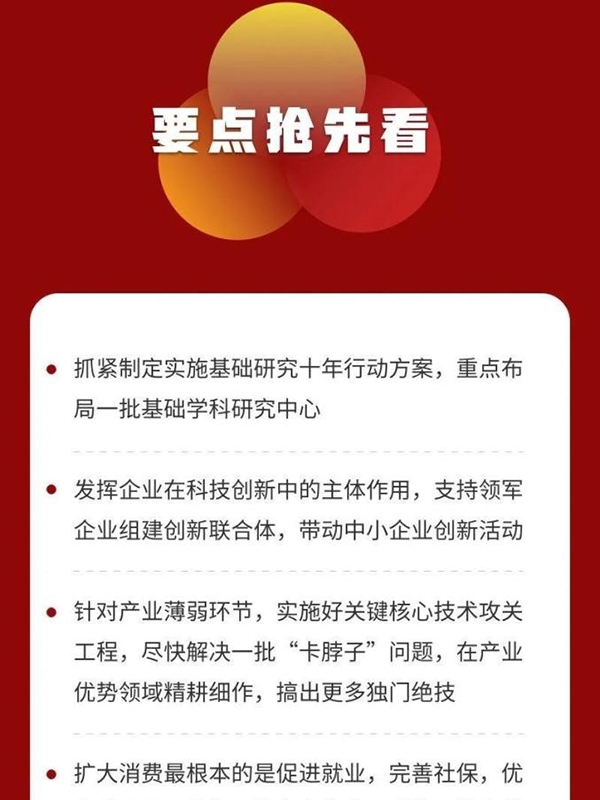 一是強化國家戰(zhàn)略科技力量。要充分發(fā)揮國家作為重大科技創(chuàng)新組織者的作用,堅持戰(zhàn)略性需求導向,確定科技創(chuàng)新方向和重點,著力解決制約國家發(fā)展和安全的重大難題。要發(fā)揮新型舉國體制優(yōu)勢,發(fā)揮好重要院所高校國家隊作用,推動科研力量優(yōu)化配置和資源共享。要抓緊制定實施基礎研究十年行動方案,重點布局一批基礎學科研究中心,支持有條件的地方建設國際和區(qū)域科技創(chuàng)新中心。要發(fā)揮企業(yè)在科技創(chuàng)新中的主體作用,支持領軍企業(yè)組建創(chuàng)新聯(lián)合體,帶動中小企業(yè)創(chuàng)新活動。要加強國際科技交流合作。要加快國內(nèi)人才培養(yǎng),使更多青年優(yōu)秀人才脫穎而出。要完善激勵機制和科技評價機制,落實好攻關任務“揭榜掛帥”等機制。要規(guī)范科技倫理,樹立良好學風和作風,引導科研人員專心致志、扎實進取。
