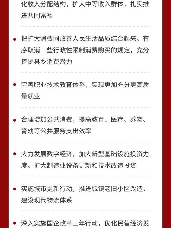 三是堅持擴大內(nèi)需這個戰(zhàn)略基點。形成強大國內(nèi)市場是構建新發(fā)展格局的重要支撐,必須在合理引導消費、儲蓄、投資等方面進行有效制度安排。擴大消費最根本的是促進就業(yè),完善社保,優(yōu)化收入分配結構,擴大中等收入群體,扎實推進共同富裕。要把擴大消費同改善人民生活品質(zhì)結合起來。有序取消一些行政性限制消費購買的規(guī)定,充分挖掘縣鄉(xiāng)消費潛力。要完善職業(yè)技術教育體系,實現(xiàn)更加充分更高質(zhì)量就業(yè)。要合理增加公共消費,提高教育、醫(yī)療、養(yǎng)老、育幼等公共服務支出效率。要增強投資增長后勁,繼續(xù)發(fā)揮關鍵作用。要發(fā)揮中央預算內(nèi)投資在外溢性強、社會效益高領域的引導和撬動作用。激發(fā)全社會投資活力。要大力發(fā)展數(shù)字經(jīng)濟,加大新型基礎設施投資力度。要擴大制造業(yè)設備更新和技術改造投資。要實施城市更新行動,推進城鎮(zhèn)老舊小區(qū)改造,建設現(xiàn)代物流體系。要加強統(tǒng)一規(guī)劃和宏觀指導,統(tǒng)籌好產(chǎn)業(yè)布局,避免新興產(chǎn)業(yè)重復建設。