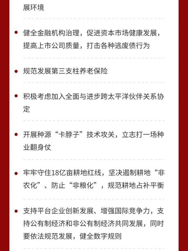 四是全面推進改革開放。構建新發(fā)展格局,必須構建高水平社會主義市場經(jīng)濟體制,實行高水平對外開放,推動改革和開放相互促進。要完善宏觀經(jīng)濟治理,加強國際宏觀政策協(xié)調(diào)。要深入實施國企改革三年行動,優(yōu)化民營經(jīng)濟發(fā)展環(huán)境,健全現(xiàn)代企業(yè)制度,完善公司治理,激發(fā)各類市場主體活力。要放寬市場準入,促進公平競爭,保護知識產(chǎn)權,建設統(tǒng)一大市場,營造市場化、法治化、國際化營商環(huán)境。要健全金融機構治理,促進資本市場健康發(fā)展,提高上市公司質(zhì)量,打擊各種逃廢債行為。要規(guī)范發(fā)展第三支柱養(yǎng)老保險。要積極考慮加入全面與進步跨太平洋伙伴關系協(xié)定。要大力提升國內(nèi)監(jiān)管能力和水平,完善安全審查機制,重視運用國際通行規(guī)則維護國家安全。