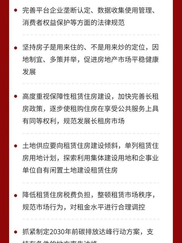 七是解決好大城市住房突出問題。住房問題關系民生福祉。要堅持房子是用來住的、不是用來炒的定位,因地制宜、多策并舉,促進房地產(chǎn)市場平穩(wěn)健康發(fā)展。要高度重視保障性租賃住房建設,加快完善長租房政策,逐步使租購住房在享受公共服務上具有同等權利,規(guī)范發(fā)展長租房市場。土地供應要向租賃住房建設傾斜,單列租賃住房用地計劃,探索利用集體建設用地和企事業(yè)單位自有閑置土地建設租賃住房,國有和民營企業(yè)都要發(fā)揮功能作用。要降低租賃住房稅費負擔,整頓租賃市場秩序,規(guī)范市場行為,對租金水平進行合理調(diào)控。