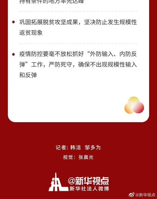 會議強調(diào),明年是我國現(xiàn)代化建設進程中具有特殊重要性的一年。做好明年經(jīng)濟工作,要以習近平新時代中國特色社會主義思想為指導,全面貫徹黨的十九大和十九屆二中、三中、四中、五中全會精神,堅持穩(wěn)中求進工作總基調(diào),立足新發(fā)展階段,貫徹新發(fā)展理念,構建新發(fā)展格局,以推動高質(zhì)量發(fā)展為主題,以深化供給側結構性改革為主線,以改革創(chuàng)新為根本動力,以滿足人民日益增長的美好生活需要為根本目的,堅持系統(tǒng)觀念,鞏固拓展疫情防控和經(jīng)濟社會發(fā)展成果,更好統(tǒng)籌發(fā)展和安全,扎實做好“六穩(wěn)”工作、全面落實“六保”任務,科學精準實施宏觀政策,努力保持經(jīng)濟運行在合理區(qū)間,堅持擴大內(nèi)需戰(zhàn)略,強化科技戰(zhàn)略支撐,擴大高水平對外開放,確?!笆奈濉遍_好局,以優(yōu)異成績慶祝建黨100周年。