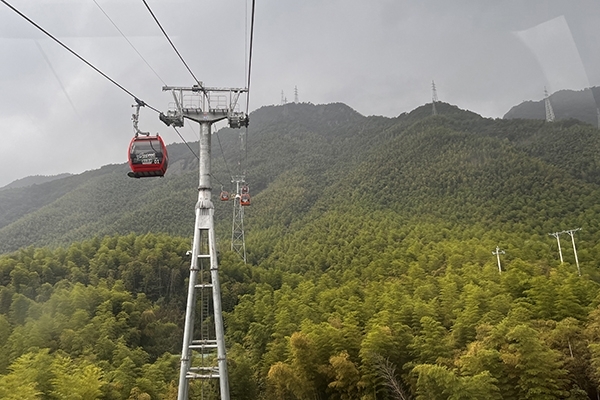 經(jīng)過2個小時的車程,我們到達山腳下,但是又該怎么穿過群山,到達云端?答案就在下面,索道帶我們一步步接近秋空。這是一個2.3公里長的路程,43度至大傾角,落差有754米。坐在吊廂,一路領(lǐng)略那綠油蔥蔥。20分鐘的空中索道旅途,“↗→↘”,這就是我們經(jīng)過的姿勢,由下而上、由仰到俯,過癮?。。。?!